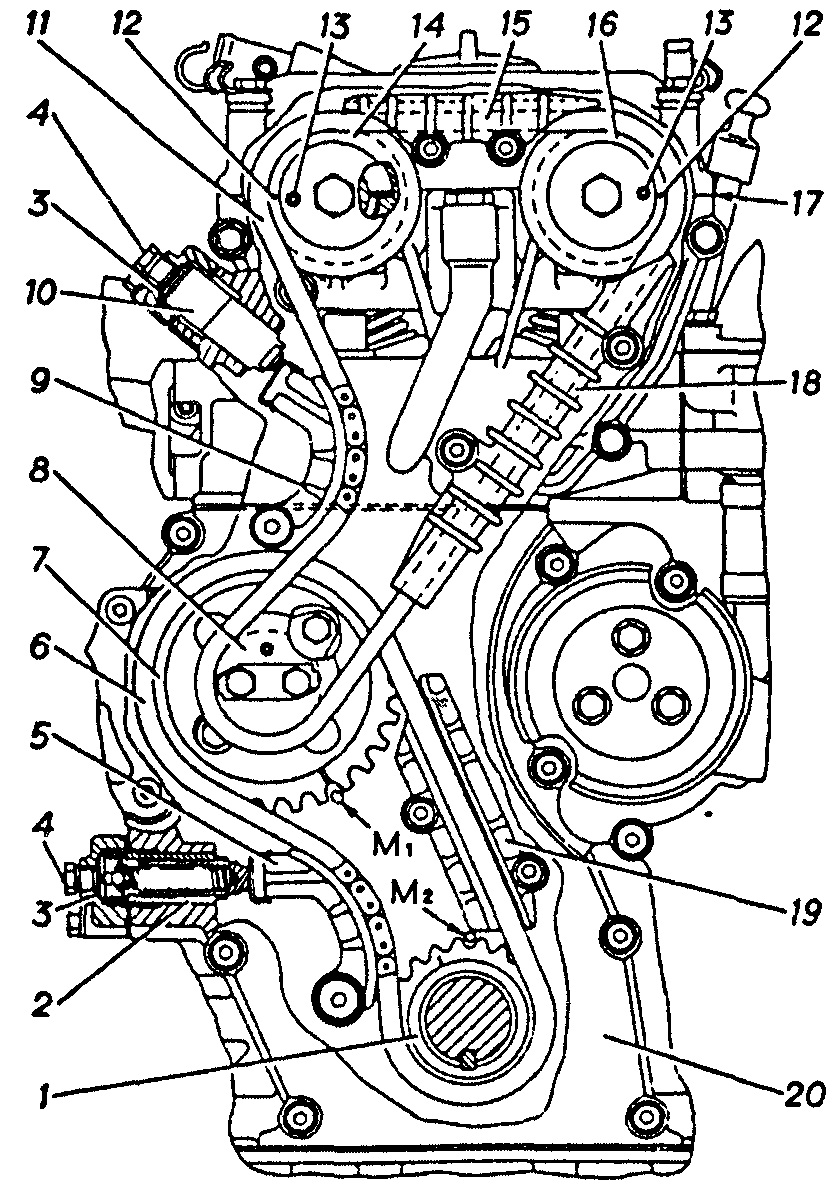 Рис. 10 Привод распределительных валов; 1 - звездочка коленчатого вша; 2 - гпдропатяжитель нижней цепи; 3 - шумоизолирующая резиновая шайба; 4 - пробка; 5 - башмак гидропатяжптеля нижней цепи; 6 - нижняя цель; 7 - ведомая звездочки промежуточного вала; 8 - ведущая звездочка промежуточного вала; 9 -башмак гидронатяжителя верхней цепи; 10 - гидрой а тяжи тель верхней цепи; 11 - верхняя цепь; 12 - установочная метка на звездочке; 13 - установочный штифт; 14 - звездочка распределительного вала впускных кшгапов; 15 - верхний успокоитель цепи; 16 - звездочка распределительного вала выпускных клапанов; 17 - верхняя шюскость головки блока цилиндров; 18 - средний успокоитель цепи; 19 - нижний успокоитель цепи; 20 - крышка цепи; Ml и М2 • установочные метки на блоке цилиндров